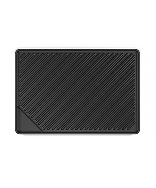 У плиты есть ножки для подачи на стол и углубленный уголок для слива масла.