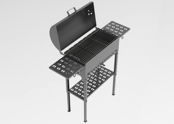 Специальные заслонки в крышке и передней стенки позволяют регулировать необходимый уровень подачи воздуха. А с помощью термометра можно легко следить за температурой внутри. Гриль хорошо поддерживает жар, не требуя большого количества топлива, благодаря отверстиям для циркуляции воздуха. Боковые и нижняя полки предназначены для размещения посуды или других предметов в доступном месте.