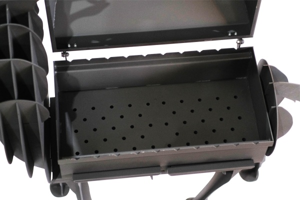 Вся конструкция изготовлена из конструкционной стали Ст.3СП 5 и выкрашена несколькими слоями термостойкой черной краски, что делает данное устройство надежным и долговечным. Масса изделия нетто составляет 42 кг.