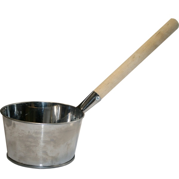 Ковш выполнен из нержавеющей стали, устойчивой к повышенным температурам, коррозии и повреждениям. Ручка выполнена из дерева, обработанного специальным водоотталкивающим составом. Объем ковша - 1,5 л.
