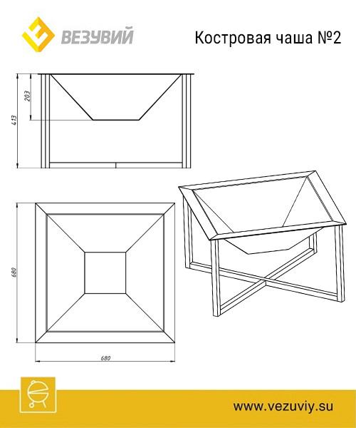 Форма перевёрнутой усечённой пирамиды концентрирует горящие дрова в центре костровой чаши Везувий № 2 и позволяет убирать золу и не прогоревшие дрова из чаши без помощи совка. Для ухода за этой моделью будет достаточно только кочерги.
