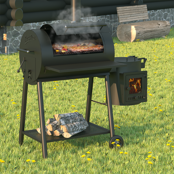 Для удобного использования на передней поверхности смокера сделана съёмная стальная полка для размещения продуктов и посуды. Смокер установлен на подставке с надёжными стальными ножками. В нижней части подставки сделана полка, на которой удобно хранить дрова и инструменты для работы со смокером. Две ножки смокера оснащены колёсами для удобства перемещения изделия по зоне барбекю. Для перекатывания смокера используется ручка на боковой стороне основного модуля смокера.