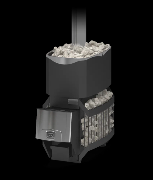 • Выход дымовой трубы смещен от края к центру каменки, что значительно упрощает монтаж дымохода.