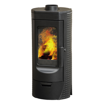 Вертикальная конструкция и верхнее подключение дымохода позволяют располагать печь в помещении не только с удобством, но и с большой экономией для полезного жилого пространства. Спектакль огня в печи TARA отличается особенной красотой, так как вытянутая форма печи и, соответственно, топочной камеры, предоставляет много места для пламени, которому есть где разгуляться. Плоское огнеупорное стекло топки не коптится и не загрязняется за счет отличной работы системы «чистое стекло». На дверце печи есть удобная ручка. Внизу печь укомплектована небольшим, но функциональным закрытым дровником.