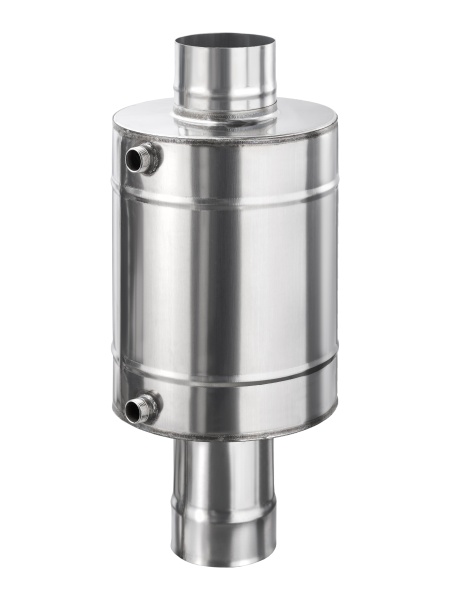 Для этой цели на дымоход печи устанавливается универсальный регистр (теплообменник), из нержавеющей стали с двумя штуцерами ¾ дюйма, который с помощью соединительных труб и дренажного крана соединяется с выносным баком.